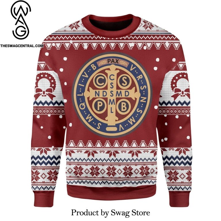 Saint Benedict Medal All Over Printed Christmas Ugly Wool Knitted Sweater Description Information: