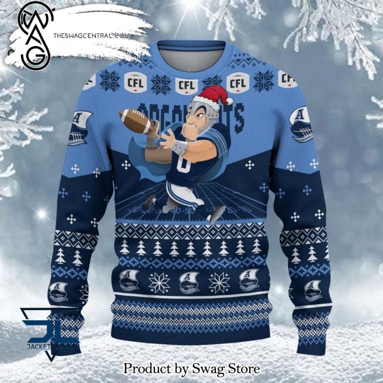 The Toronto Argonauts CFL Mascot Blue Christmas Design Ugly Christmas Holiday Sweater is a festive and fun tradition that has become a staple of the holiday season. Characterized by its bold, often over-the-top designs, these sweaters embrace the spirit of the holidays with a sense of humor and cheer. Typically featuring vibrant colors, these sweaters are adorned with a variety of holiday-themed motifs such as snowmen, reindeer, Santa Claus, Christmas trees, and an array of wintry patterns. The charm of these sweaters lies in their deliberate gaudiness and playful designs, often incorporating elements like flashing lights, tinsel, and 3D decorations. The Ugly Christmas Holiday Sweater transcends mere fashion to become a symbol of festive fun, often worn at holiday parties, family gatherings, and even in workplace celebrations. It’s a lighthearted way to celebrate the holiday season, bringing smiles and laughter to all who partake in this quirky yet endearing tradition.